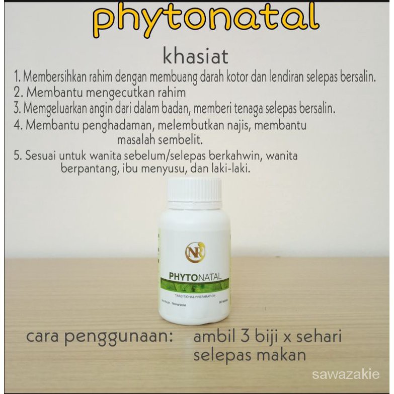 Pengambilan phytonatal boleh diteruskan walaupun sudah habis berpantang. Keterangan Cara Penggunaan Phytonatal 90 tablets 30 hari - 14000 180 tablets 44 hari - RM20500 Untuk di makan Khasiat Membantu membersihkan rahim dengan mengeluarkan angin lendir dan darah kotoran dalam sistem badan. Sekiranya penyakit berlarutan sila berjumpa doktor.